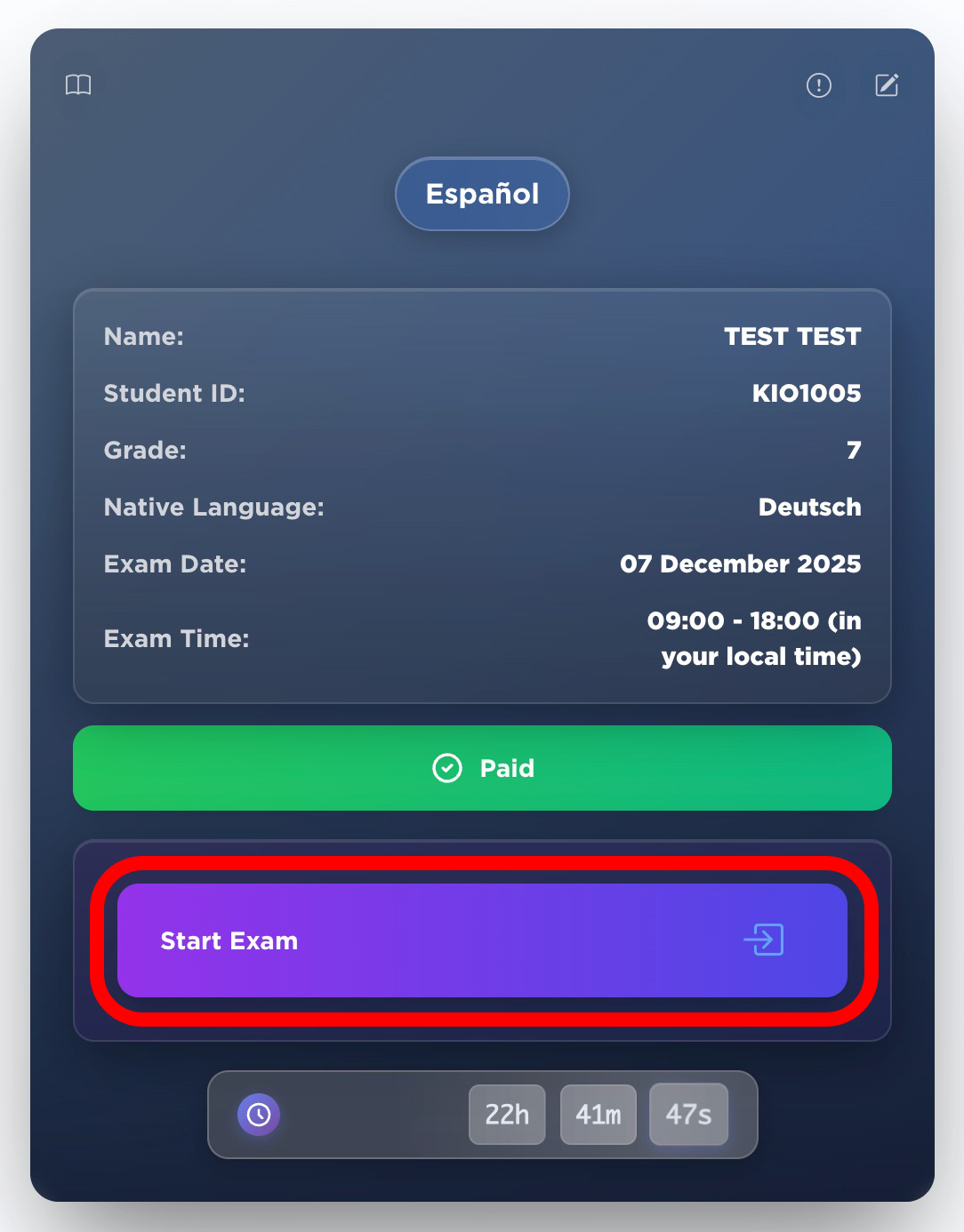 Q1: Where can I start my exam? I didn’t receive a link. Log in to your Hi-Lingua student panel. Click the START EXAM button on your exam card. Do not click the START EXAM button before reading all the instructions and making sure you are ready.